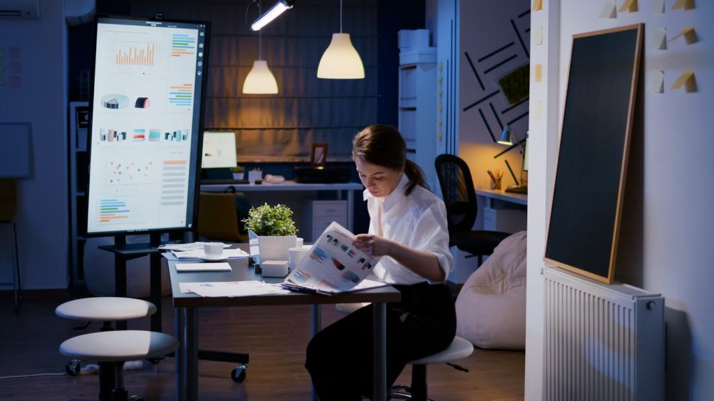 Akustikpaneele in Türen, Filz in Schubladen und entkoppelte Geräteböden mindern Geräusche. So entstehen konzentrierte Zonen. Welche Maßnahme brachte spürbare Ruhe? Teilen Sie Tipps und helfen Sie anderen, fokussierter zu arbeiten.